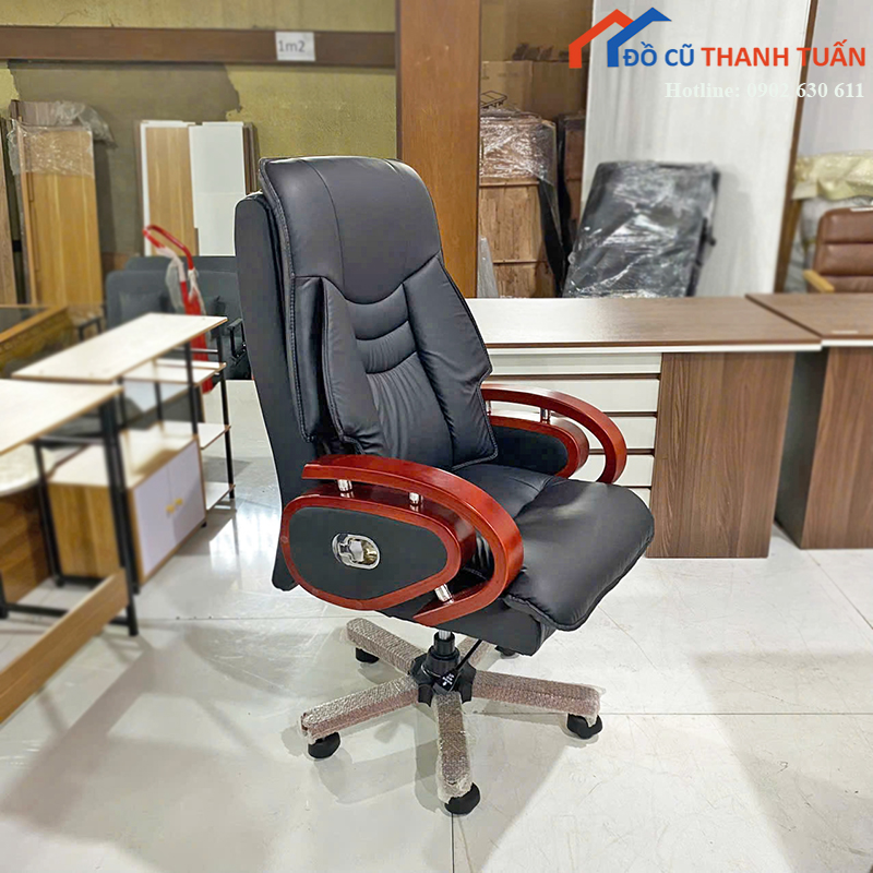 Ghế Giám Đốc Bọc Da Màu Đen Tay Vịn Gỗ Mới 99%