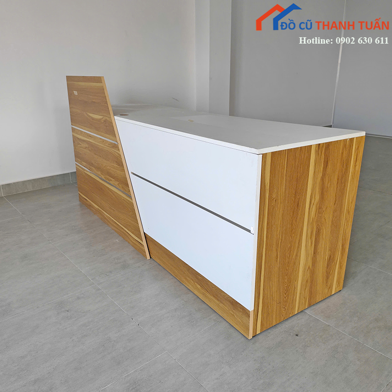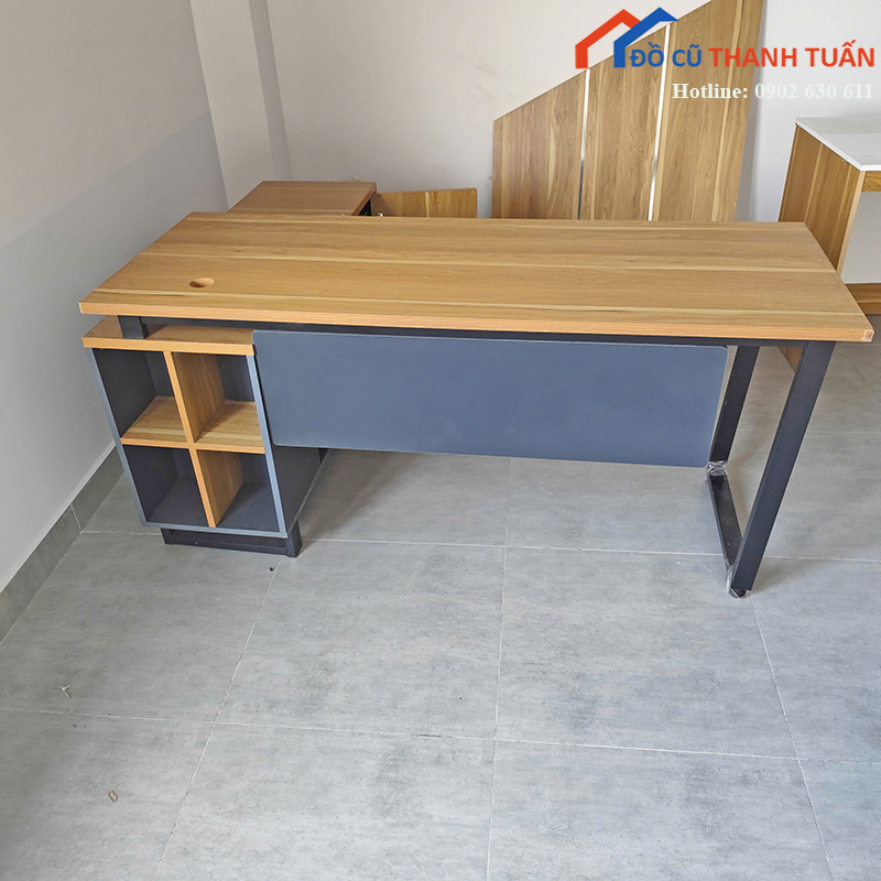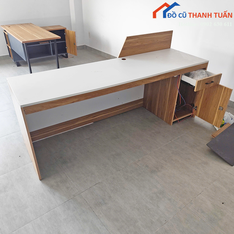 Mô tả: Bàn giám đốc cũ với thiết kế hiện đại, kết hợp giữa gỗ MDF màu trắng và màu gỗ vàng, tạo điểm nhấn cho không gian làm việc. Bàn có mặt bàn rộng rãi, phù hợp để đặt máy tính, tài liệu và các vật dụng cần thiết. Thiết kế với phần chân bàn và các ngăn kéo giúp tăng cường không gian lưu trữ và giúp văn phòng luôn gọn gàng. Chất liệu gỗ công nghiệp bền bỉ, dễ dàng vệ sinh và giữ được vẻ ngoài đẹp lâu dài.