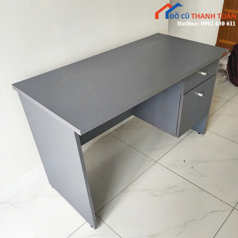 Mô tả: Bàn làm việc được thiết kế với kiểu dáng đơn giản, màu xám hiện đại, phù hợp cho nhiều không gian văn phòng hoặc sử dụng tại nhà. Bàn có hai ngăn kéo bên phải, giúp lưu trữ hồ sơ, giấy tờ và các vật dụng cá nhân gọn gàng, ngăn nắp. Kích thước vừa phải, dễ sắp xếp trong phòng làm việc nhỏ hoặc góc học tập. Mặt bàn rộng rãi, có thể đặt laptop, màn hình và phụ kiện văn phòng.