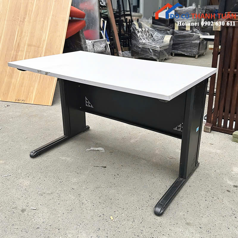 Mô tả: Bàn làm việc có thiết kế đơn giản, chắc chắn, phù hợp cho không gian làm việc tại công ty hoặc ở nhà. Mặt bàn gỗ công nghiệp màu trắng sáng, dễ lau chùi, chống trầy nhẹ. Khung và chân bàn làm bằng kim loại màu đen, chịu lực tốt. Bàn có che phía trước tạo sự kín đáo và tăng độ vững chắc. Kích thước vừa phải, đủ để đặt máy tính, tài liệu và các vật dụng cần thiết.
