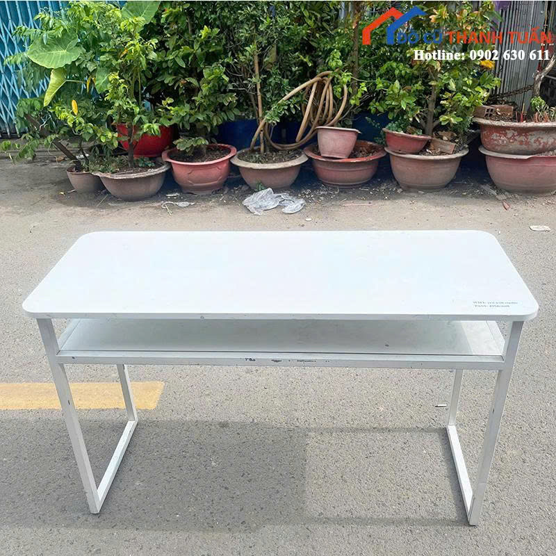 Mô tả: Bàn làm việc có thiết kế tối giản, dễ bố trí trong nhiều không gian từ văn phòng, phòng học đến cửa hàng. Mặt bàn gỗ phủ màu trắng sáng, chống trầy xước và dễ lau chùi. Khung bàn bằng sắt bền chắc, chịu lực tốt, giúp bàn luôn ổn định khi sử dụng. Phía dưới có kệ phụ để tài liệu, sách hoặc phụ kiện, giữ cho không gian làm việc gọn gàng. Kiểu dáng gọn nhẹ, dễ di chuyển và tiết kiệm diện tích.