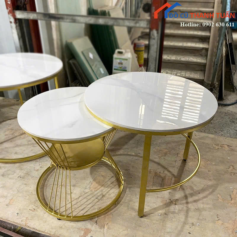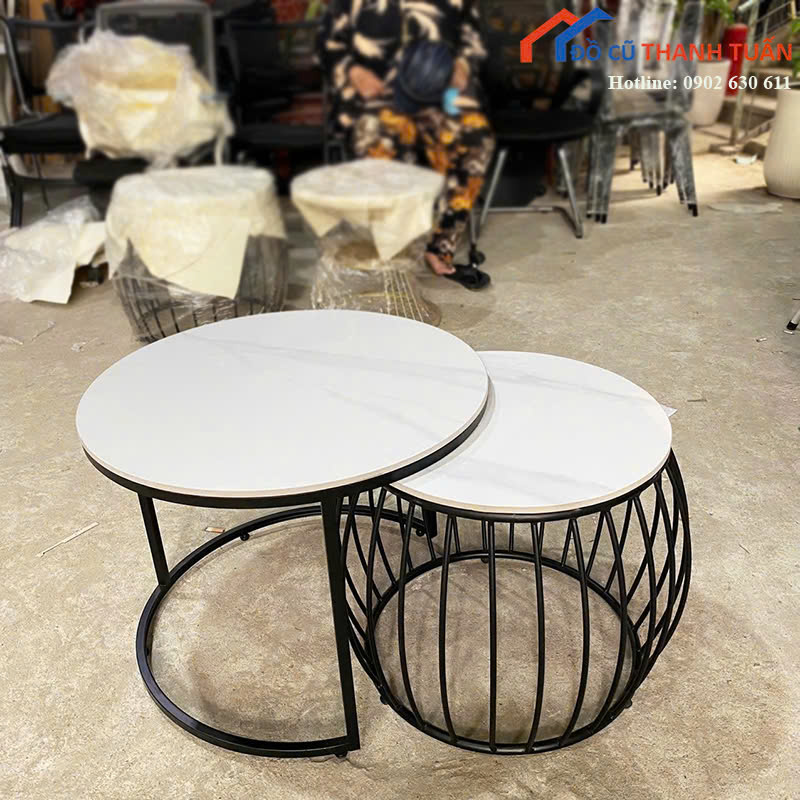 Mô tả: Bàn sofa đôi thiết kế dạng bộ hai bàn tròn với kiểu dáng hiện đại, phù hợp đặt trước ghế sofa trong phòng khách. Mặt bàn đá màu trắng sáng giúp không gian trông sạch sẽ và dễ lau chùi khi sử dụng hằng ngày. Bộ bàn gồm một bàn lớn và một bàn nhỏ có thể đặt lồng vào nhau hoặc tách riêng để tiện sử dụng khi tiếp khách.