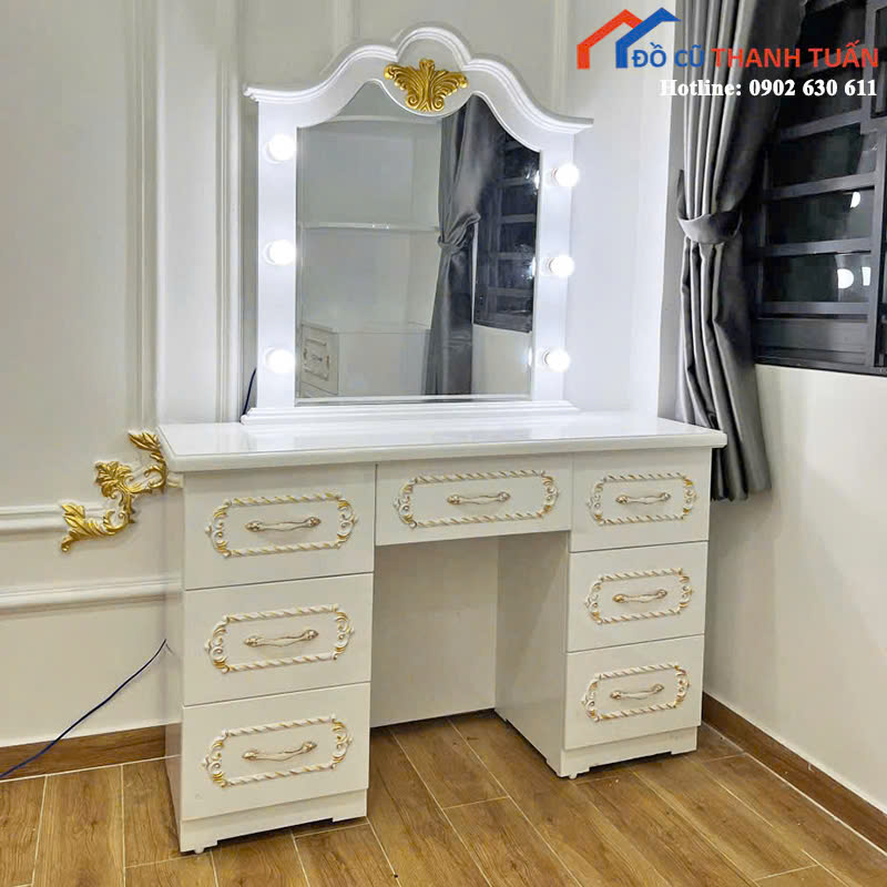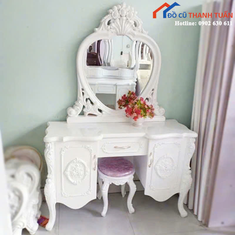 Mẫu bàn trang điểm thanh lý kiểu dáng cổ điển sơn trắng này là lựa chọn hoàn hảo để tăng thêm sự sang trọng cho phòng ngủ. Khách hàng có thể đến trực tiếp Đồ Cũ Thanh Tuấn để xem sản phẩm thực tế hoặc liên hệ nhanh qua Zalo để được tư vấn và giữ hàng, đảm bảo có được sản phẩm ưng ý nhất.