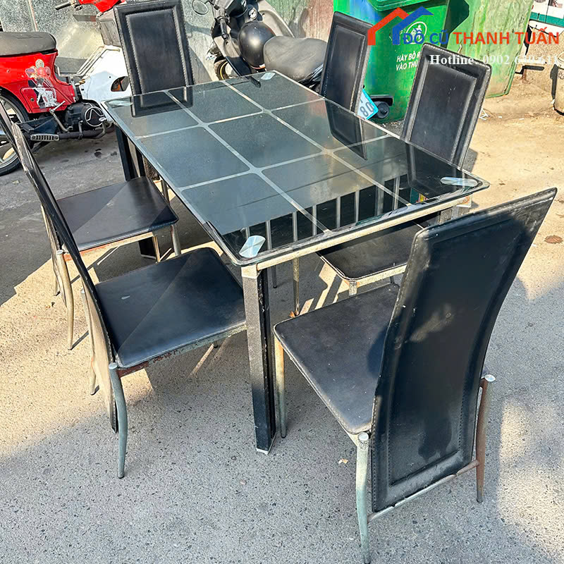 Bộ Bàn Ăn 1M35x80CM Cũ 6 Ghế Bọc Da Màu Đen