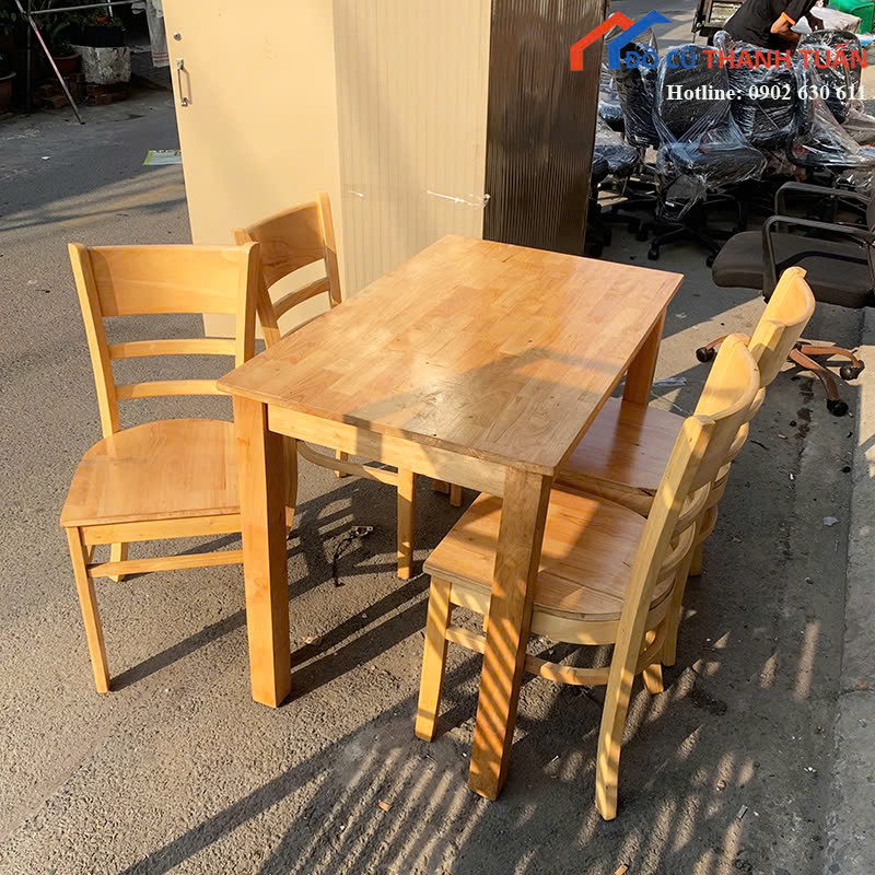 Mô tả: Bộ bàn ăn gỗ 4 ghế này phù hợp sử dụng cho gia đình nhỏ, căn hộ chung cư, phòng trọ cao cấp hoặc quán ăn gia đình. Bàn thiết kế dạng vuông gọn gàng, kích thước vừa phải, dễ sắp xếp trong nhiều không gian khác nhau. Mặt bàn phẳng, ghế tựa lưng chắc chắn, ngồi thoải mái khi dùng bữa hằng ngày. Gỗ tự nhiên màu sáng tạo cảm giác ấm cúng, dễ phối với các đồ nội thất khác.