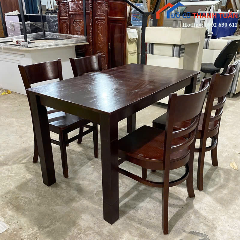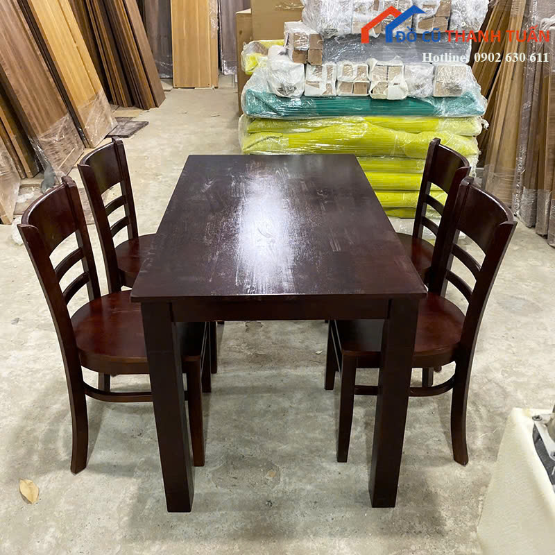 Mô tả: Bộ bàn ăn gỗ gồm 1 bàn và 4 ghế, thiết kế đơn giản, phù hợp cho gia đình nhỏ hoặc căn hộ, phòng trọ, nhà cho thuê. Bàn dáng chữ nhật rộng rãi, bề mặt gỗ phẳng, dễ lau chùi trong quá trình sử dụng hằng ngày. Ghế tựa lưng chắc chắn, chiều cao ngồi thoải mái, phù hợp cho bữa ăn gia đình hoặc tiếp khách thân mật. Gỗ còn cứng cáp, kết cấu ổn định, không rung lắc. Màu nâu đậm tạo cảm giác ấm cúng, dễ phối với nhiều không gian bếp khác nhau.