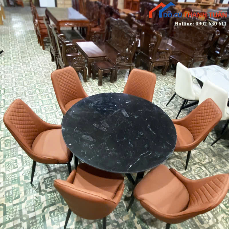 Mô tả: Bộ bàn ăn tròn gồm 1 bàn tròn mặt đá và 6 ghế ngồi đồng bộ, kiểu dáng hiện đại, bố cục gọn gàng. Mặt bàn đá màu đen vân tự nhiên, dễ lau chùi, chịu lực tốt khi sử dụng hằng ngày. Chân bàn chắc chắn, đứng vững, không rung lắc. Ghế ăn bọc da màu xám, đệm ngồi êm, lưng ghế may họa tiết tạo cảm giác sang trọng khi đặt trong phòng ăn.