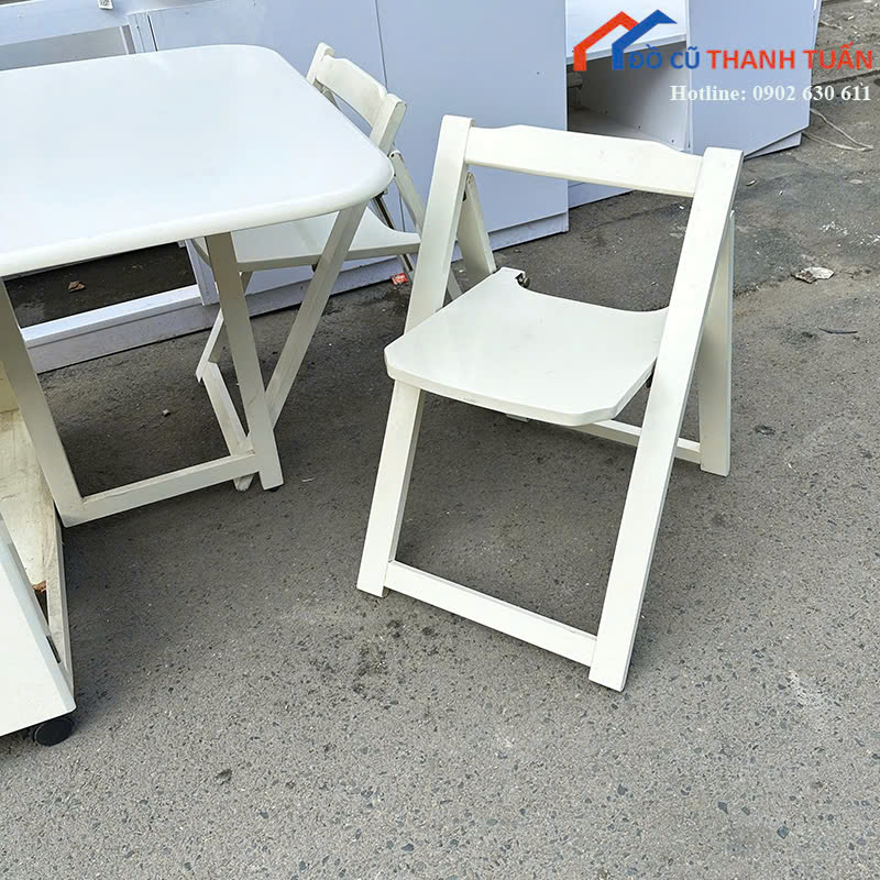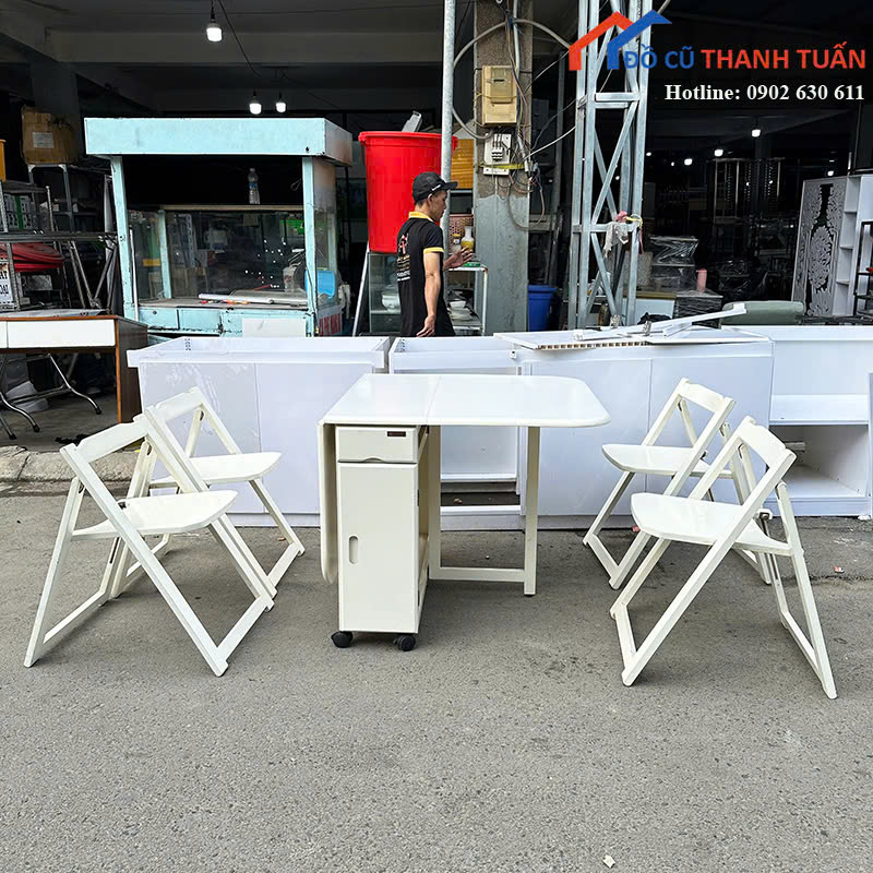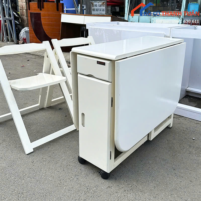 Mô tả: Bộ bàn ghế gấp cũ màu trắng gồm bàn xếp có bánh xe và ghế gấp gọn. Thiết kế đơn giản, dễ xếp mở nên rất tiết kiệm diện tích, phù hợp với nhà trọ, căn hộ nhỏ hoặc dùng làm bàn ăn, bàn làm việc đều được. Bàn có thêm ngăn kéo tiện lợi để đồ dùng nhỏ. Ghế gấp nhẹ, dễ di chuyển và cất giữ khi không dùng. Màu trắng trung tính dễ phối với nhiều không gian khác nhau.