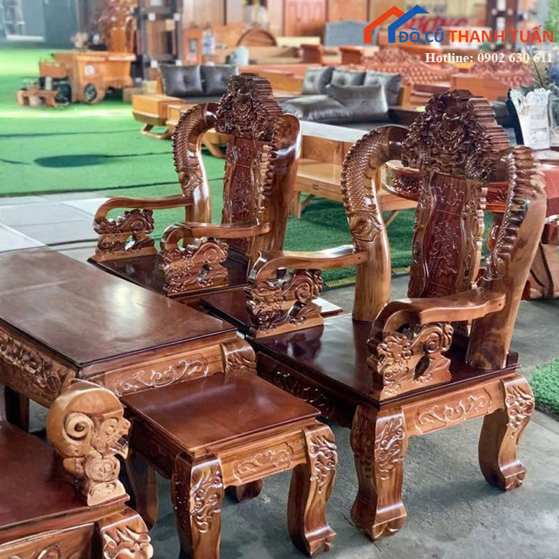 Mô tả: Bộ salon gỗ phù hợp cho phòng khách gia đình, nhà phố hoặc biệt thự mang phong cách truyền thống. Ghế được thiết kế lưng cao, tay cong chắc chắn, ngồi thoải mái, không bị mỏi khi tiếp khách lâu. Toàn bộ bề mặt gỗ được chạm rồng nổi sắc nét, tạo điểm nhấn sang trọng và bề thế cho không gian. Bộ bàn ghế giúp không gian phòng khách gọn gàng, lịch sự, vừa dùng tiếp khách vừa thể hiện gu thẩm mỹ.