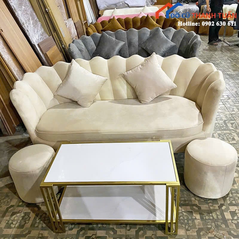 Mô tả: Bộ sofa bọc vải nhung gồm ghế băng dài, 2 ghế đôn và bàn trà. Ghế được thiết kế kiểu dáng vỏ sò đẹp mắt tạo nên một bộ ghế xinh xắn và sang trọng. Phần đệm ghế mềm mại kết hợp với các gối tựa ôm tạo sự thoải mái khi ngồi. Màu sắc dễ thương và nổi bật, dễ phối hợp với nhiều phong cách nội thất, đặc biệt là không gian phòng ngủ, phòng khách hoặc quán cà phê. Ghế chân thấp, dễ dàng di chuyển và tiết kiệm diện tích cho không gian nhỏ.