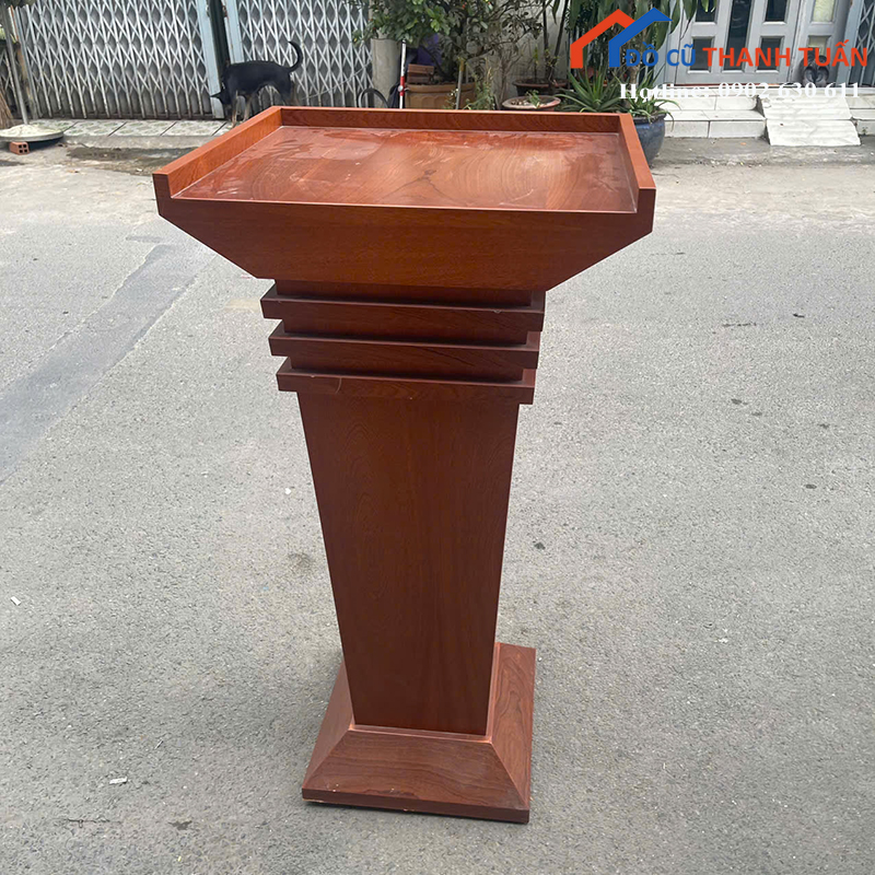 Mô tả: Bục được thiết kế dạng đứng chắc chắn, kiểu dáng vuông vức, màu gỗ nâu sang trọng và lịch sự. Phần mặt bục rộng, có viền bao quanh giúp đặt tài liệu, giấy tờ hoặc thiết bị nhỏ gọn gàng khi thuyết trình. Thân bục thiết kế liền khối, trụ đứng vững, đế vuông lớn phù hợp dùng làm bục phát biểu cho hội trường, phòng họp, trường học, nhà thờ hoặc các buổi sự kiện, khai trương.