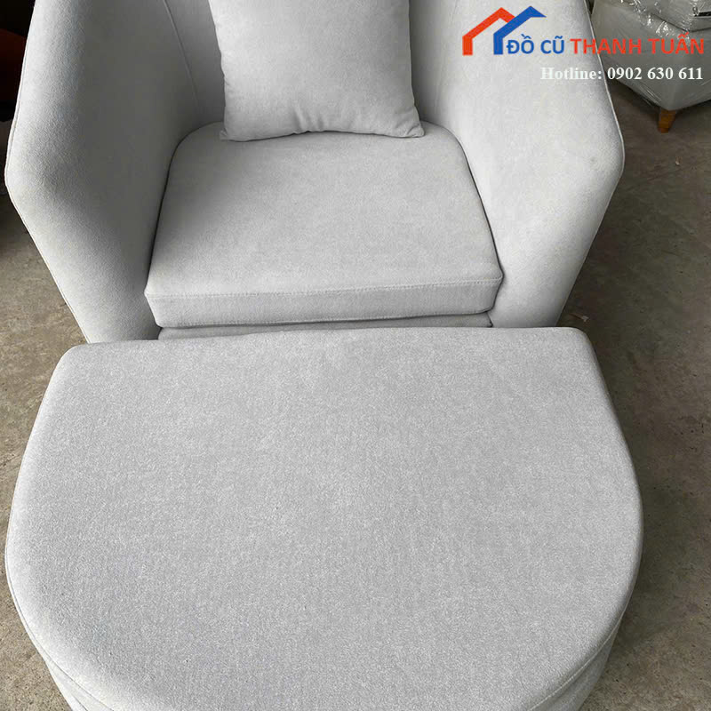 Mô tả: Ghế sofa đơn thiết kế dáng bo tròn gọn gàng, kèm đôn tròn phía trước giúp kê chân hoặc ngồi phụ rất tiện. Phần lưng ghế ôm nhẹ, có gối tựa rời tạo cảm giác ngồi êm và thoải mái khi thư giãn. Bề mặt ghế bọc vải màu sáng, nhìn sạch sẽ và dễ phối với nhiều không gian nội thất khác nhau. Kích thước vừa phải, phù hợp đặt trong phòng khách nhỏ, phòng ngủ, căn hộ mini hoặc khu vực tiếp khách.