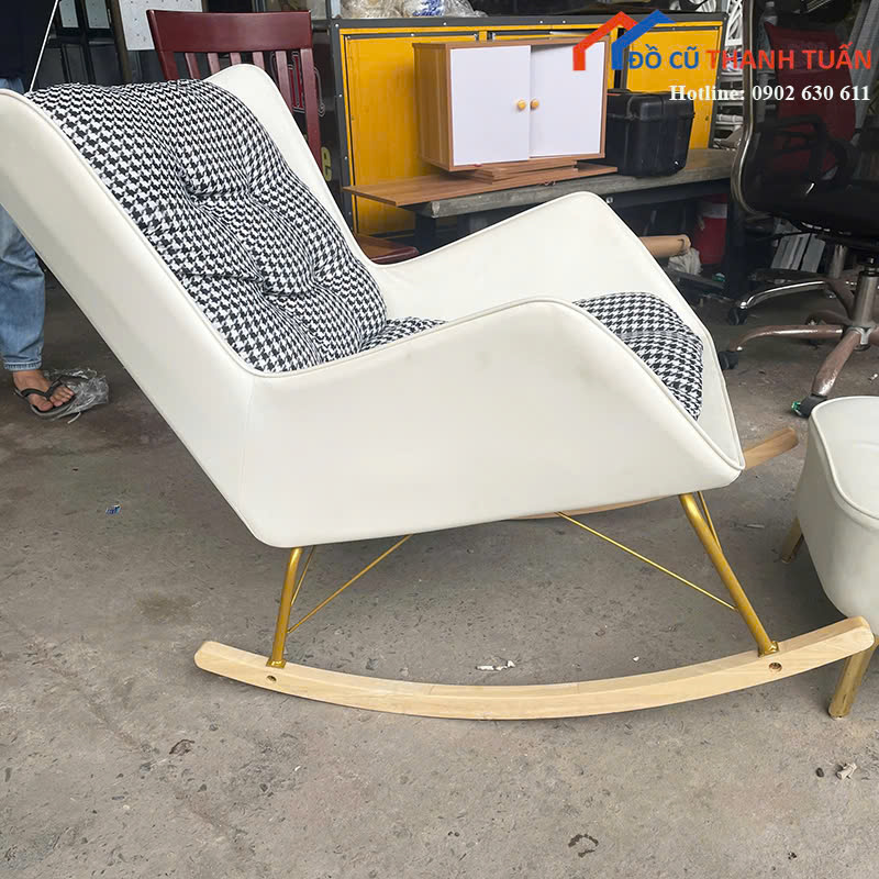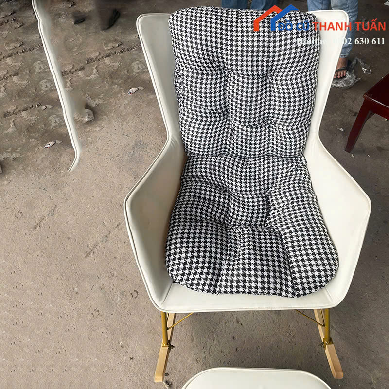 Mô tả: Ghế bập bênh thiết kế hiện đại, khung chân gỗ cong kết hợp khung sắt sơn vàng nổi bật, tạo sự chắc chắn và thẩm mỹ. Phần ghế bọc da trắng cao cấp, mềm mịn và dễ lau chùi, đi kèm đệm ngồi caro đen trắng dày dặn, mang lại cảm giác êm ái và sang trọng. Ghế có kèm đôn tựa chân giúp thư giãn tối đa sau giờ làm việc.