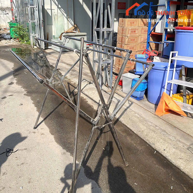Mô tả: Cây phơi đồ làm từ inox, thiết kế đơn giản nhưng chắc chắn, phù hợp sử dụng cho gia đình, phòng trọ, nhà cho thuê hoặc tiệm giặt ủi nhỏ. Khung inox cứng cáp, chịu lực tốt, có thể treo được nhiều quần áo cùng lúc mà không bị cong võng. Kiểu dáng dạng gấp gọn giúp dễ dàng di chuyển và cất gọn khi không sử dụng, tiết kiệm diện tích.