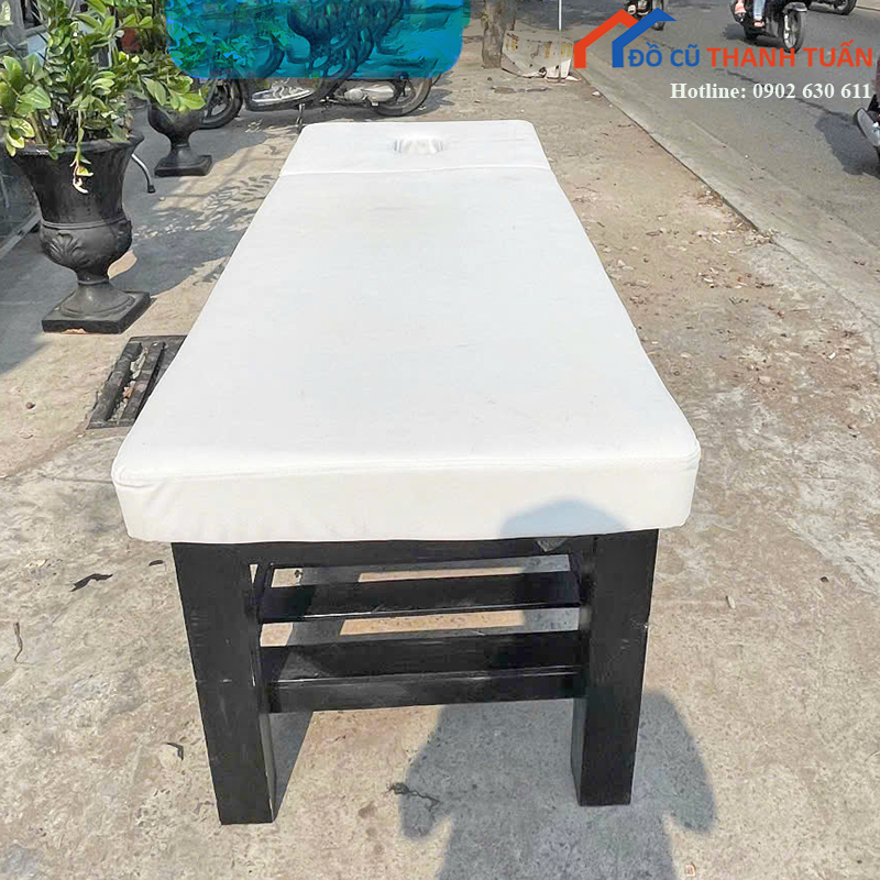 - Mô Tả: Giường massage, spa cũ với thiết kế đơn giản và tiện dụng, phù hợp cho các cơ sở spa, massage. Giường có màu trắng ngà, tạo cảm giác sạch sẽ và dễ dàng phối hợp với các không gian nội thất khác nhau. Mặt giường được bọc đệm dày êm ái, có lỗ tròn để đặt đầu giúp khách hàng thư giãn thoải mái. Bên dưới giường có kệ để đồ rộng rãi, tiện lợi cho việc sắp xếp dụng cụ spa. Kết cấu giường chắc chắn, đảm bảo an toàn và ổn định khi sử dụng.