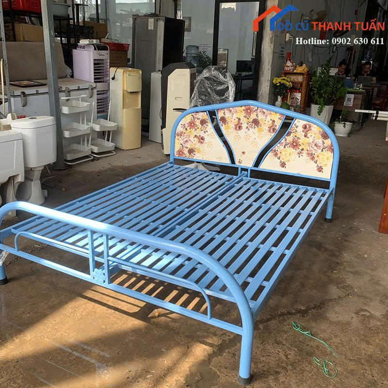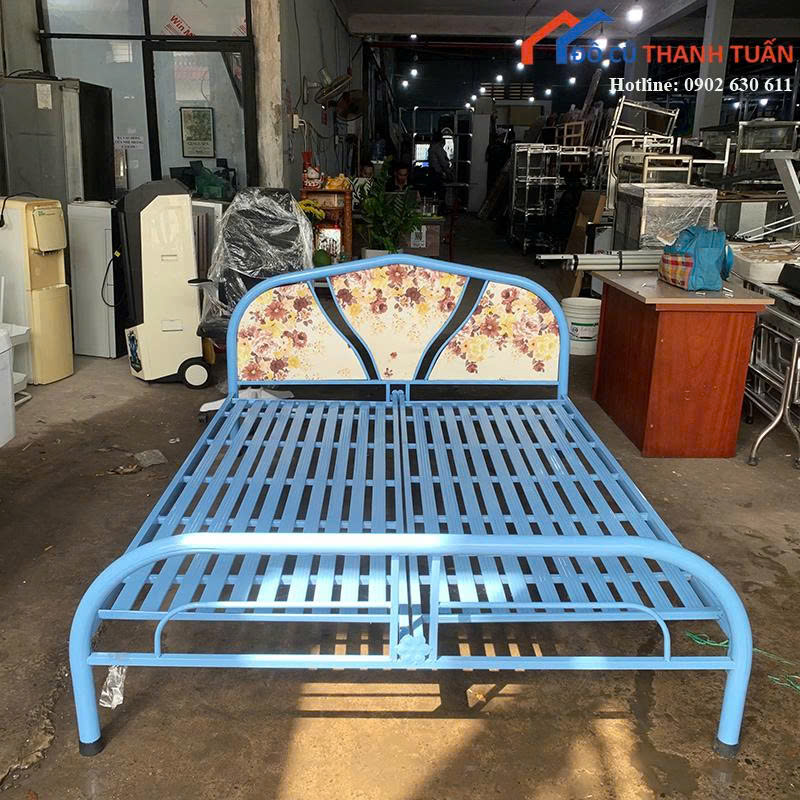 Mô tả: Giường có kích thước tiêu chuẩn 1m6 x 2m, đủ rộng rãi cho hai người lớn. Khung giường bằng sắt được sơn màu xanh dương nổi bật, vạt giường bằng các thanh sắt chắc chắn, đảm bảo độ bền và khả năng chịu lực. Đặc biệt, phần đầu giường có bọc đệm vải hoa văn, tạo điểm nhấn độc đáo.