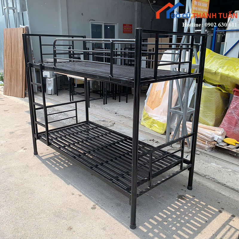 Mô tả: Giường tầng với thiết kế chắc chắn, khung sắt sơn tĩnh điện đen bền bỉ, rất phù hợp cho không gian nhỏ như ký túc xá, phòng trọ hoặc nhà ở. Mặt giường làm bằng sắt, có các thanh song chắc chắn, giúp đảm bảo độ bền và sự thoải mái khi sử dụng. Giường có kích thước 1m x 2m, phù hợp cho người lớn hoặc trẻ em. Phần lan can phía trên giúp bảo vệ an toàn khi sử dụng giường tầng.