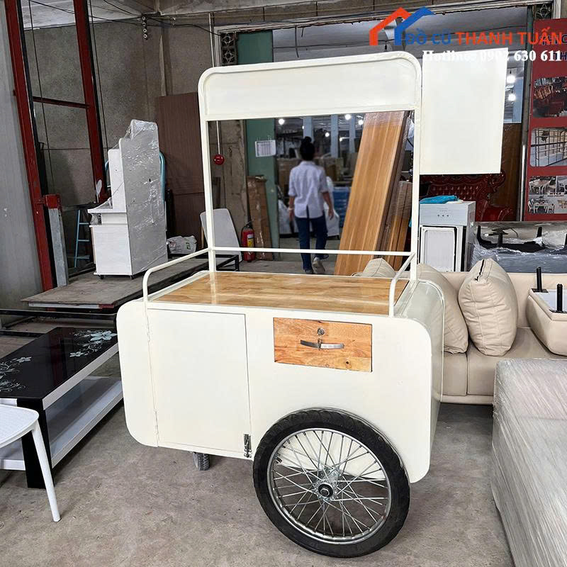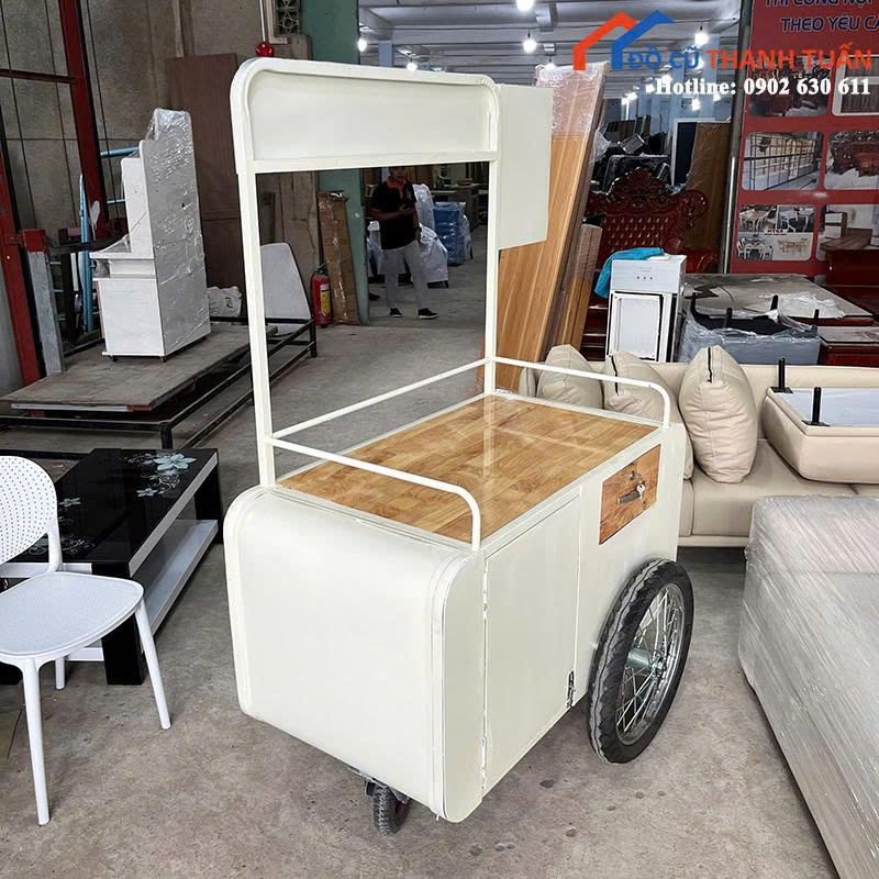 Mô tả: Xe đẩy bán hàng màu trắng kem thiết kế hiện đại, kết hợp mặt bàn gỗ sáng và khung sắt sơn tĩnh điện bền chắc. Phía dưới có ngăn tủ rộng rãi để đựng dụng cụ, vật liệu, giúp không gian buôn bán gọn gàng, sạch sẽ. Xe có bánh lớn, di chuyển nhẹ nhàng, thích hợp dùng cho mô hình kinh doanh mang đi như cafe take away, sinh tố, bánh ngọt, đồ ăn vặt.