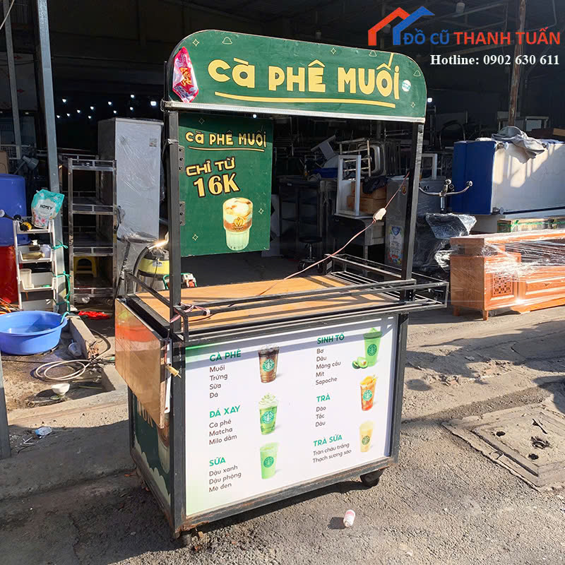 Mô tả: Quầy bán hàng được thiết kế chuyên dùng cho bán cà phê mang đi, trà sữa, sinh tố hoặc nước giải khát. Kết cấu khung sắt chắc chắn, mặt quầy rộng đủ để đặt máy pha, bình đá và các dụng cụ bán hàng cần thiết. Mặt trước được trang trí menu rõ ràng, dễ thu hút khách. Quầy có bánh xe nên di chuyển linh hoạt, phù hợp cho người mới bắt đầu kinh doanh hoặc cần đổi vị trí bán nhanh chóng.