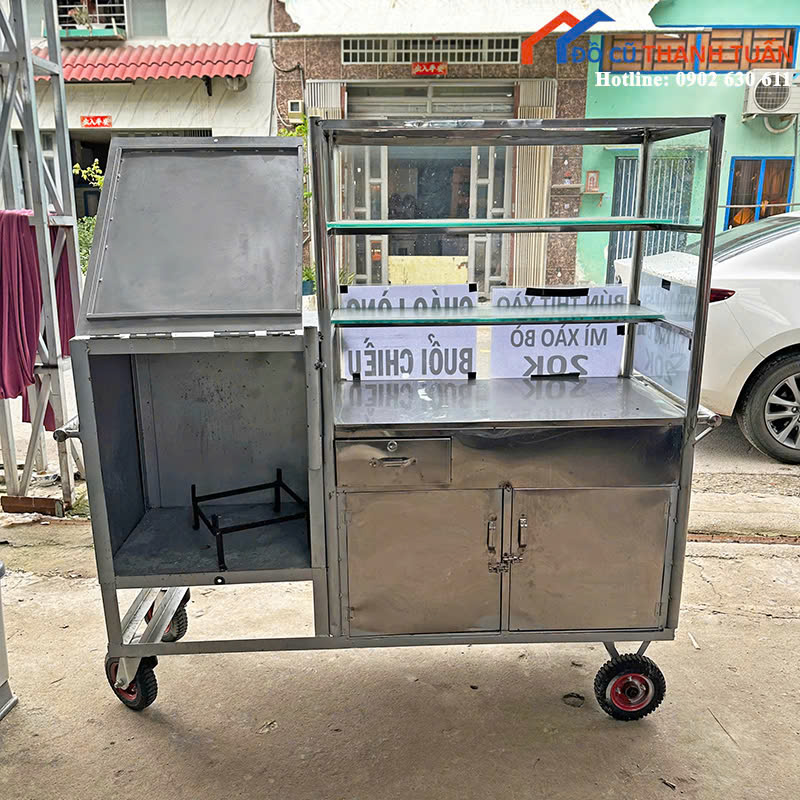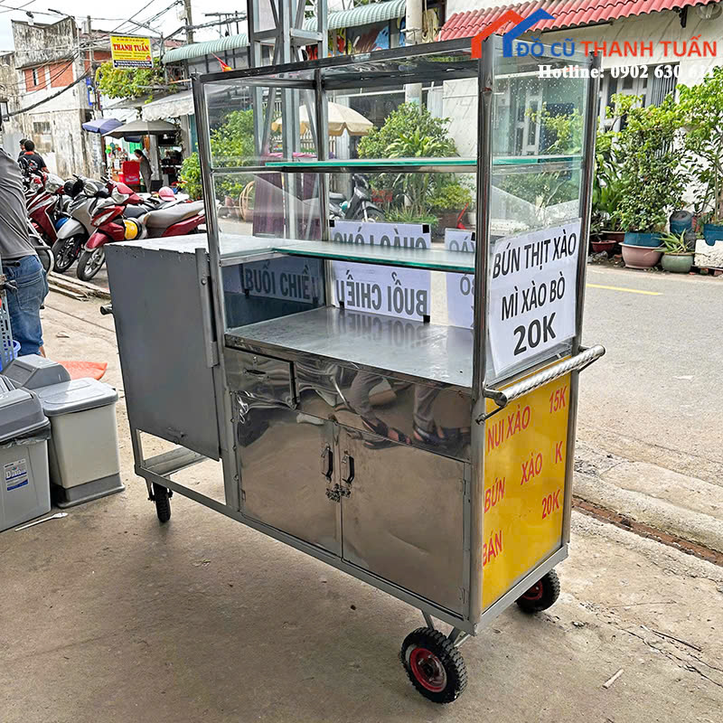 Mô tả: Quầy bán hàng inox với thiết kế khung chắc chắn, mặt bàn rộng rãi dễ bày biện đồ ăn. Phần trên được trang bị kính cường lực trong suốt, bảo quản thực phẩm sạch sẽ và hấp dẫn khi trưng bày. Bên dưới có hộc tủ khóa chắc chắn để chứa đồ, kèm bánh xe tiện di chuyển. Sản phẩm thích hợp sử dụng cho quán ăn, hàng rong, bán bún, phở, hủ tiếu, đồ chiên xào hoặc đồ uống.