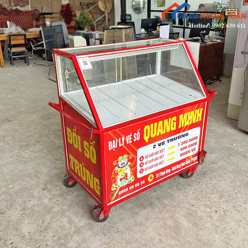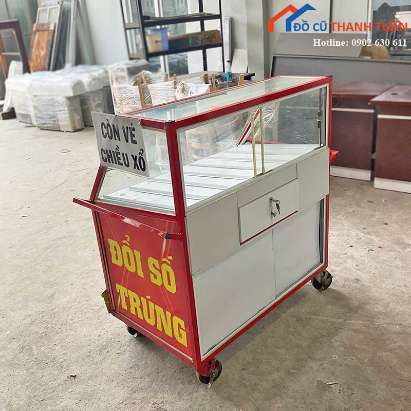 Mô tả: Quầy bán vé số thiết kế nhỏ gọn, phù hợp cho người bán vé số, bán hàng lưu động hoặc trưng bày sản phẩm nhỏ lẻ. Phần khung quầy chắc chắn, phía trên có kính trong suốt giúp dễ dàng quan sát và bảo quản hàng hóa bên trong. Quầy được trang bị bánh xe giúp di chuyển thuận tiện giữa nhiều vị trí khác nhau mà không tốn nhiều công sức. Kích thước vừa phải, không chiếm nhiều diện tích, phù hợp sử dụng ngoài trời hoặc trong khu dân cư, chợ và khu vực đông người.