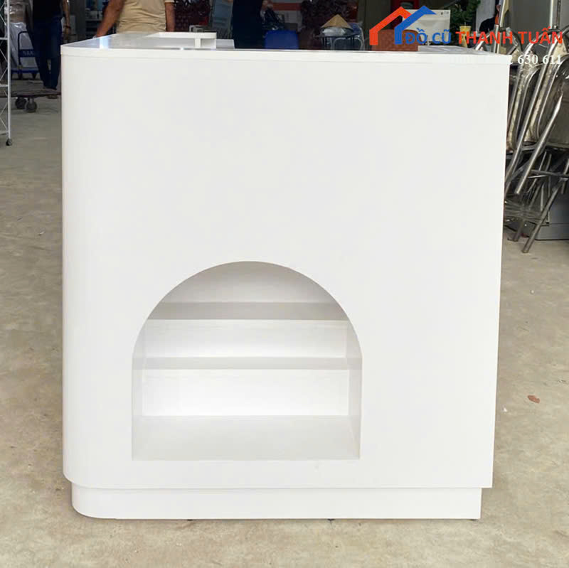 Mô tả: Quầy lễ tân trắng được thiết kế theo phong cách hiện đại, phù hợp dùng cho spa, salon tóc, shop thời trang hoặc quán nhỏ. Các góc đều được bo mềm giúp hạn chế va chạm và tạo cảm giác thanh lịch hơn khi đặt trong không gian tiếp khách. Mặt quầy rộng rãi, đủ chỗ để máy tính, bill và các vật dụng cần thiết hằng ngày. Phần hông có khoang trang trí dạng vòm, tạo điểm nhấn và có thể tận dụng để trưng đồ nhỏ.