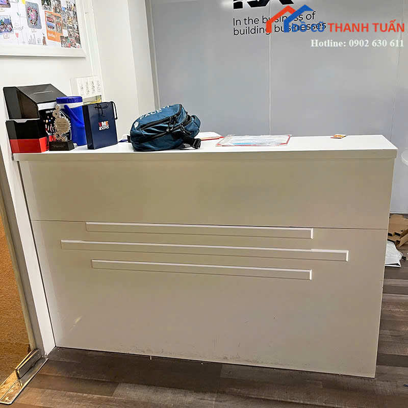 Mô tả: Quầy lễ tân màu trắng thiết kế hiện đại với kiểu dáng cao thấp tạo điểm nhấn và giúp nhân viên dễ thao tác khi tiếp đón khách. Bề mặt rộng rãi, đủ chỗ đặt máy tính, hồ sơ và các vật dụng văn phòng. Các đường sọc ngang tinh tế phía trước giúp quầy trông sang hơn mà vẫn giữ được sự đơn giản phù hợp cho văn phòng công ty, spa, showroom hoặc các cửa hàng cần khu vực tiếp khách chuyên nghiệp.