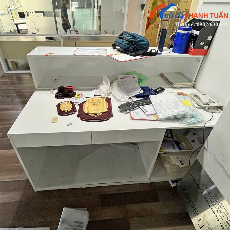 Quầy lễ tân cũ màu trắng này là lựa chọn phù hợp cho nhiều loại hình kinh doanh và đảm bảo sử dụng tốt. Anh chị có thể đến kho Đồ Cũ Thanh Tuấn xem trực tiếp hoặc nhắn Zalo để được gửi hình chi tiết và giữ hàng nhanh chóng.