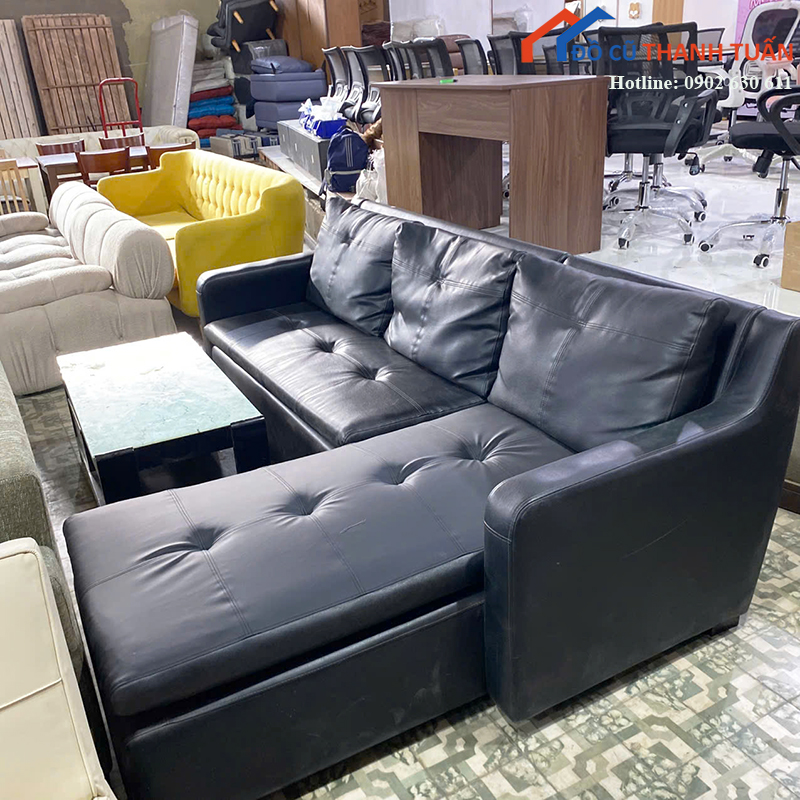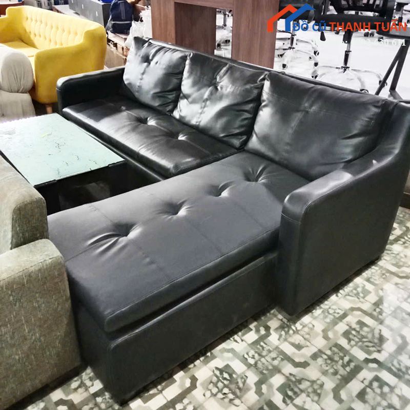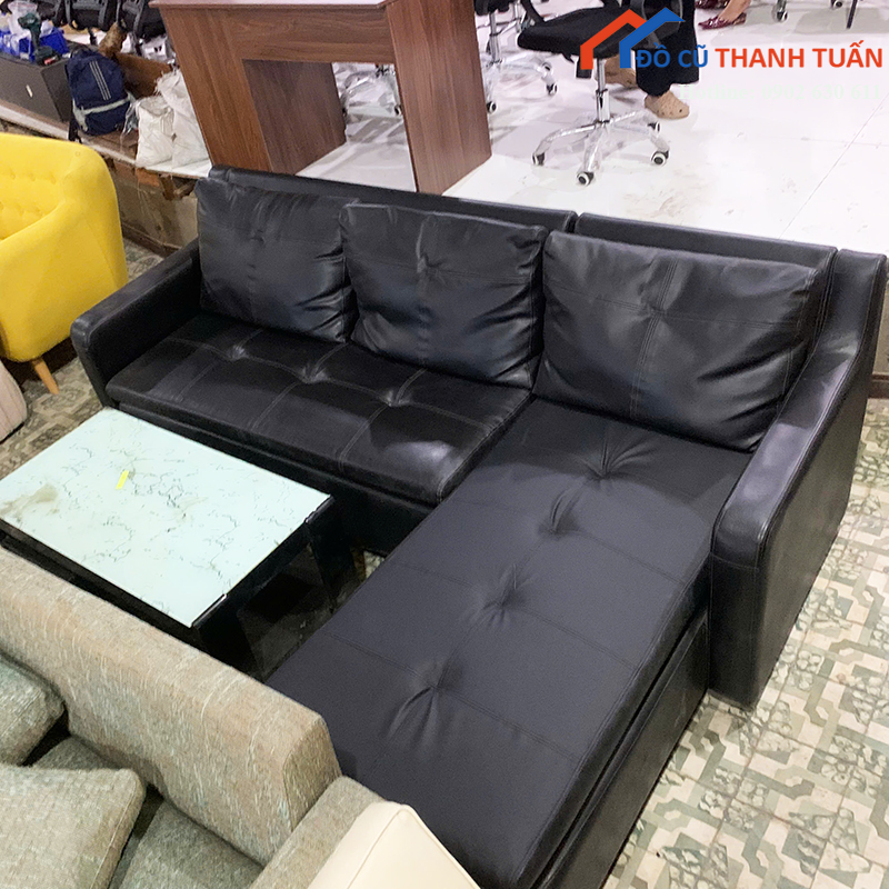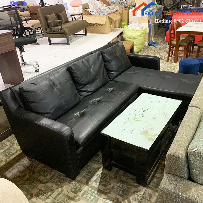 Mô tả: Bộ sofa góc chữ L bọc da màu đen, thiết kế hiện đại, phù hợp kê phòng khách gia đình, căn hộ chung cư hoặc nhà phố. Sofa có dáng góc giúp tận dụng không gian, phần ghế dài có thể ngả chân ngồi thư giãn rất thoải mái. Chất liệu da bọc trơn dễ lau chùi, ít bám bụi, phù hợp gia đình có trẻ nhỏ. Đệm ngồi còn độ đàn hồi tốt, khung sofa chắc chắn, sử dụng ổn định lâu dài. Đi kèm bàn trà mặt kính dáng gọn, tiện tiếp khách, sinh hoạt hằng ngày.