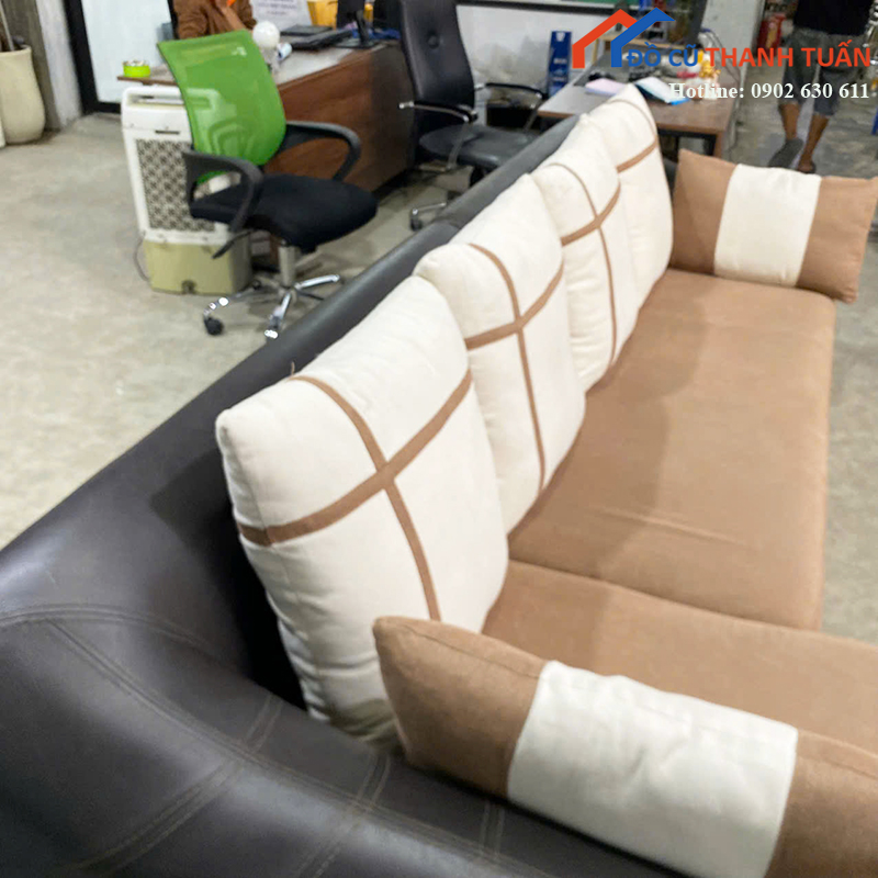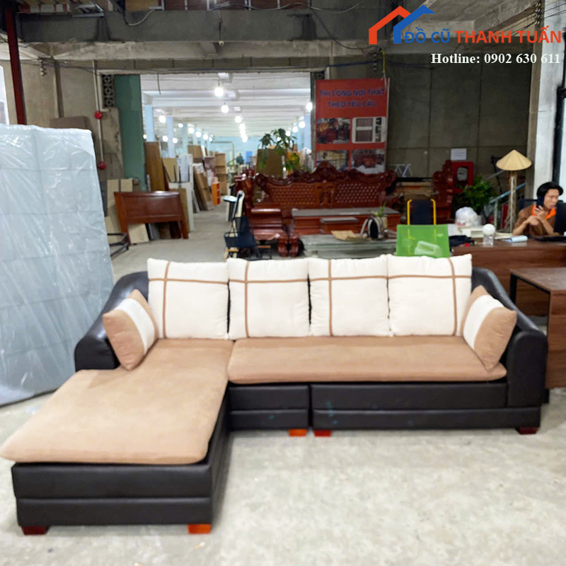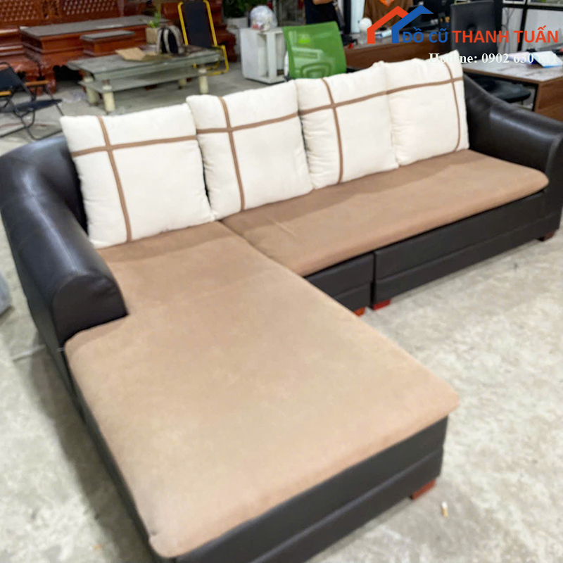Mô tả: Bộ sofa góc chữ L kích thước khoảng 2m5 x 1m6, phù hợp cho phòng khách gia đình, căn hộ hoặc không gian tiếp khách. Thiết kế có phần ghế nằm giúp thư giãn thoải mái, có thể nằm nghỉ hoặc tiếp khách đều tiện. Phần đệm ngồi dày, đi kèm gối tựa giúp tăng cảm giác êm ái khi sử dụng. Bề mặt kết hợp giữa da và vải tạo điểm nhấn, vừa dễ vệ sinh vừa mang lại cảm giác dễ chịu khi ngồi lâu. Khung sofa chắc chắn, sử dụng ổn định, đáp ứng tốt nhu cầu sinh hoạt hằng ngày.