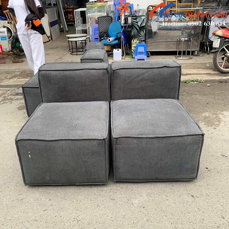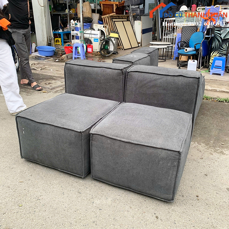 Mô tả: Sofa màu xám này có thể ghép thành dạng chữ L hoặc tách riêng tùy không gian sử dụng. Thiết kế vuông vức, form gọn nên dễ bố trí trong phòng khách căn hộ, phòng trọ hoặc homestay. Đệm ngồi dày, bề mặt phẳng, ngồi thoải mái khi tiếp khách hoặc xem tivi. Tông màu xám đậm trung tính, dễ phối với bàn trà và các đồ nội thất khác.