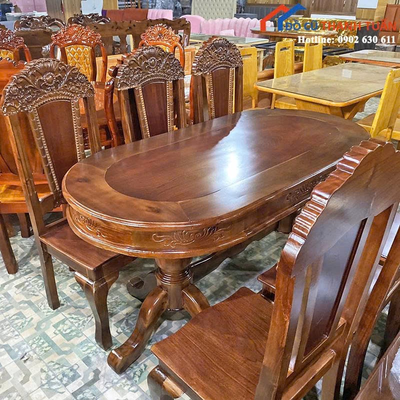 Mô tả: Bộ bàn ăn oval màu nhớt 6 ghế có thiết kế thanh lịch và sang trọng. Mặt bàn hình oval rộng rãi, màu gỗ nhớt bóng mịn, vân gỗ rõ đẹp mắt. Ghế tựa lưng cao, chạm khắc hoa văn tinh tế, ngồi thoải mái, phù hợp cho bữa ăn gia đình hoặc tiếp khách. Kết cấu bàn ghế chắc chắn, chịu lực tốt, bền bỉ theo thời gian. Phù hợp đặt tại phòng ăn gia đình, nhà hàng hoặc quán ăn cao cấp, tạo không gian ấm cúng và sang trọng.