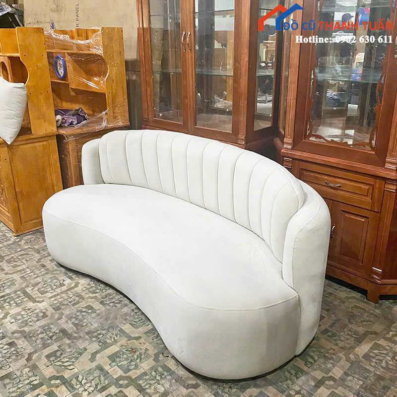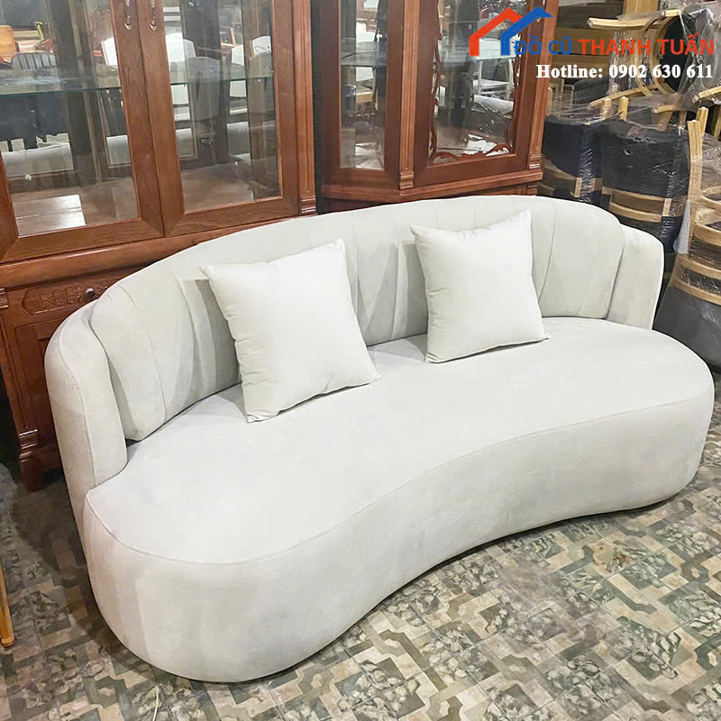 Mô tả: Sofa dáng cong nhẹ mang đến cảm giác mềm mại và tinh tế cho mọi không gian. Thiết kế dáng uốn lượn giúp tạo sự uyển chuyển, phá cách, đồng thời tăng sự thoải mái khi ngồi. Bề mặt bọc vải nhung êm ái, mát tay, kết hợp màu trắng thanh lịch phù hợp nhiều phong cách nội thất từ hiện đại đến vintage. Phần tựa lưng may rãnh dọc đều, tạo điểm nhấn nhẹ nhàng nhưng không kém phần sang trọng.
