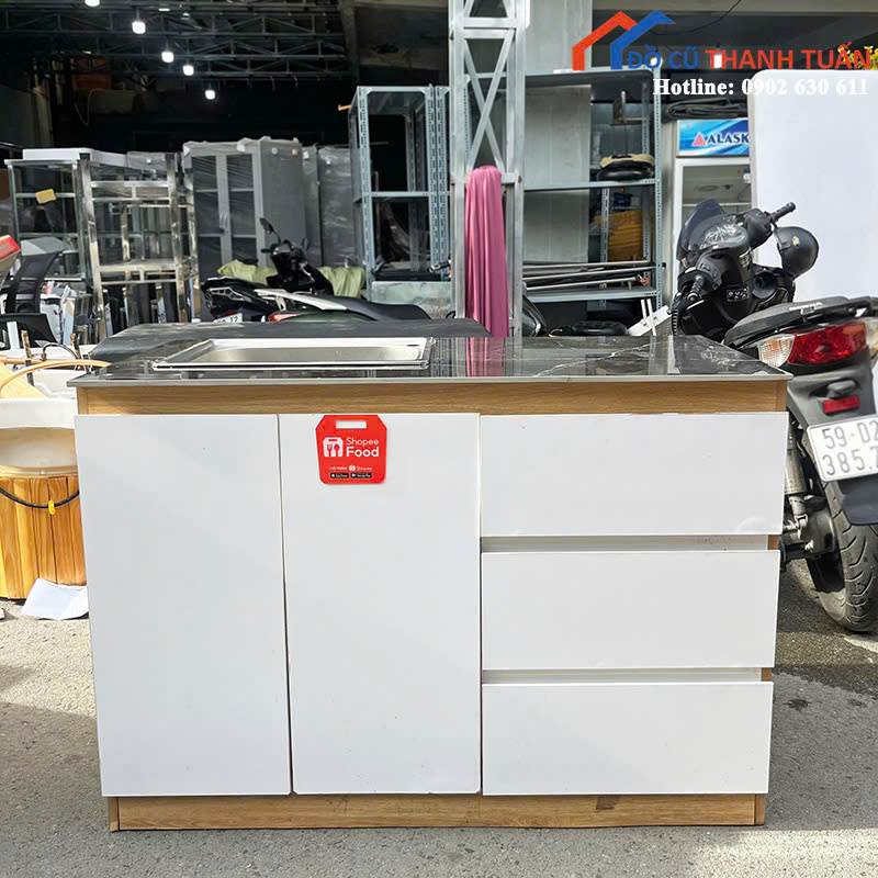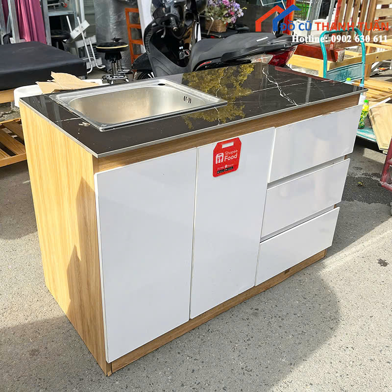 Mô tả: Tủ bếp cũ kèm bồn rửa inox là giải pháp gọn gàng và tiện ích cho không gian bếp nhỏ. Sản phẩm có thiết kế gồm nhiều ngăn tủ và hộc kéo, giúp phân loại và cất giữ dụng cụ nấu ăn, gia vị hay đồ dùng nhà bếp ngăn nắp. Mặt tủ bằng đá vân mây đen sang trọng, chống trầy xước, chống thấm nước, dễ vệ sinh sau khi sử dụng. Phần chậu rửa inox chắc chắn, tiện lợi khi sơ chế thực phẩm hay rửa chén bát.
