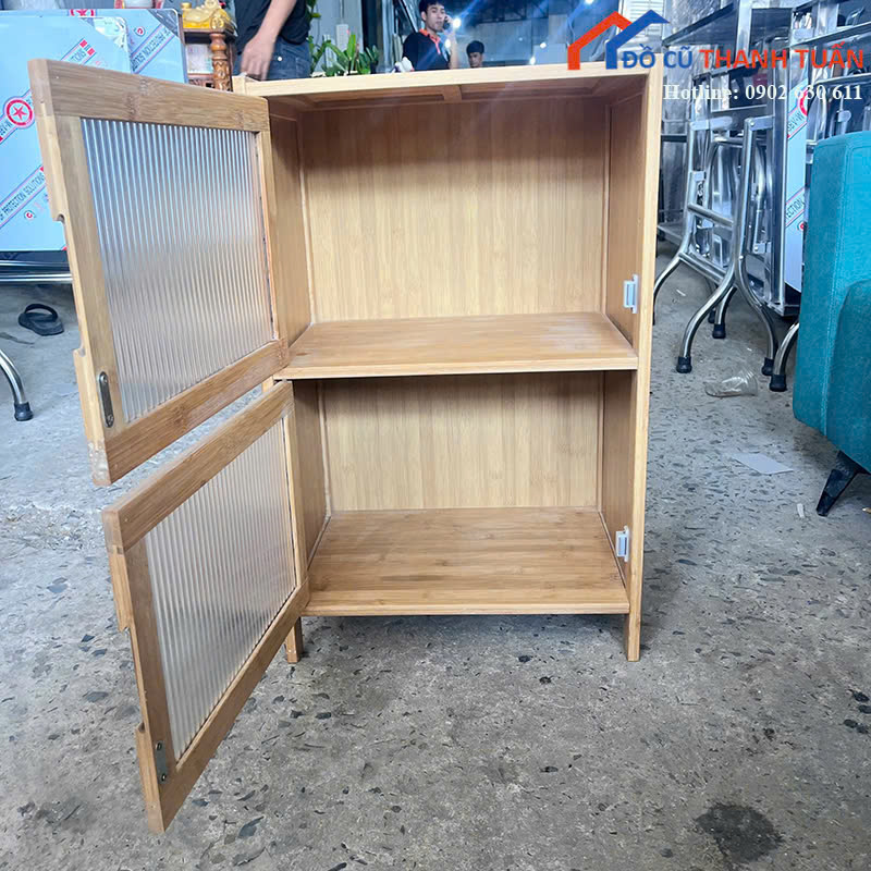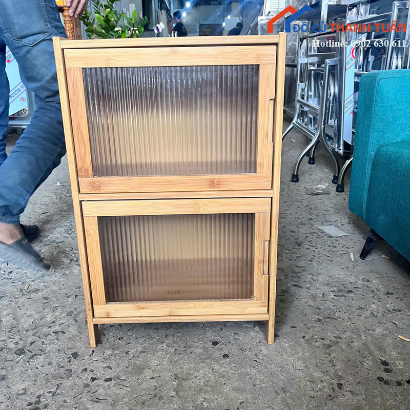 Mô tả: Tủ đựng đồ thiết kế gọn gàng, phù hợp sử dụng trong gia đình, phòng trọ, bếp hoặc cửa hàng nhỏ. Tủ gồm 2 tầng riêng biệt, mỗi tầng có cửa kính mờ dạng sọc giúp che đồ bên trong nhưng vẫn tạo cảm giác sáng và sạch sẽ. Khung gỗ chắc chắn, kết cấu ổn định, đặt độc lập hoặc kê sát tường đều tiện. Kích thước vừa phải, không chiếm nhiều diện tích, dễ dùng để đựng chén dĩa, đồ gia dụng, hồ sơ hoặc vật dụng sinh hoạt hằng ngày.