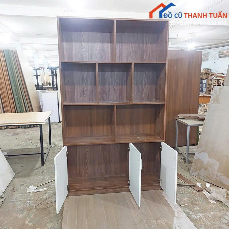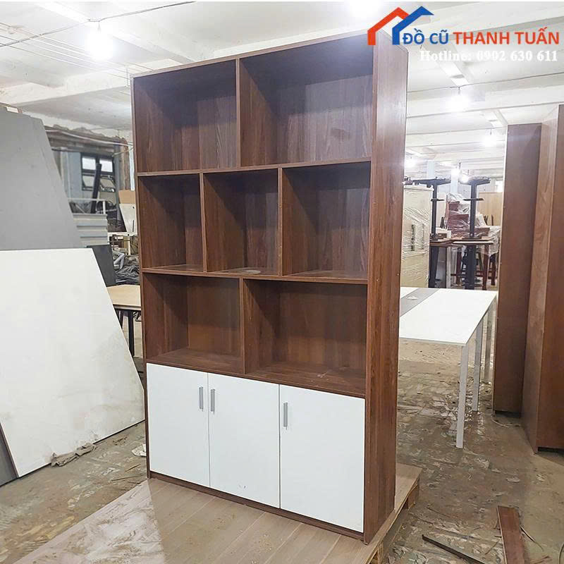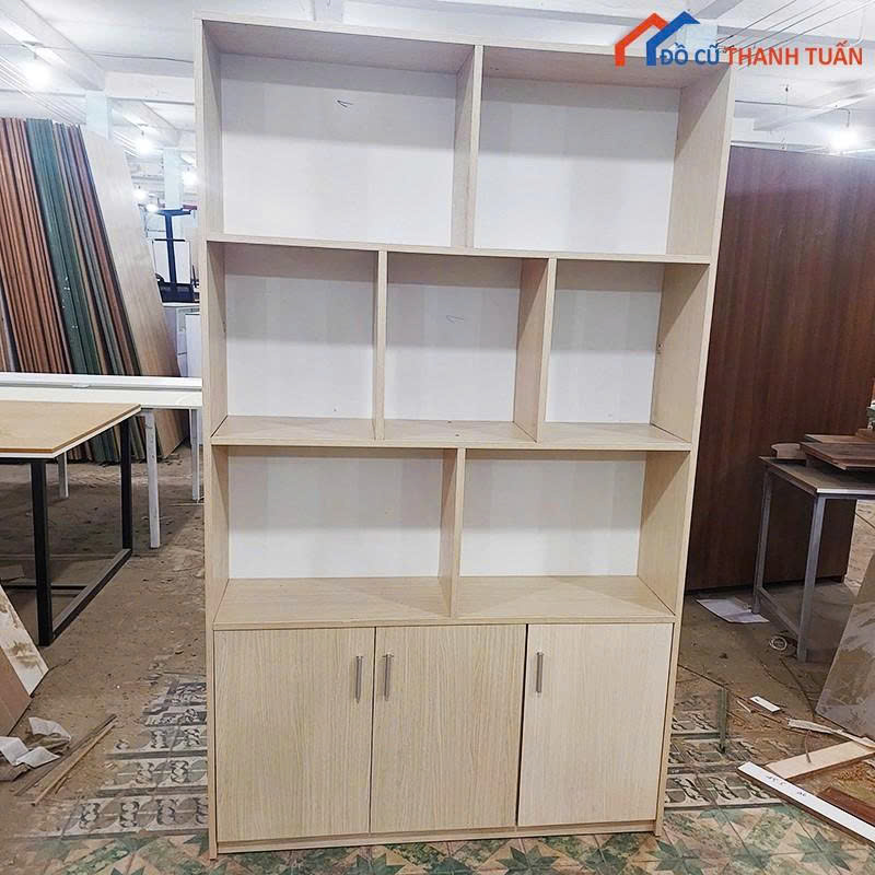 Mô tả: Tủ thiết kế kết hợp kệ mở và tủ kín, phù hợp sử dụng làm kệ sách, kệ để hồ sơ, để tài liệu, kệ trưng bày hoặc kệ lưu trữ đồ. Phần trên gồm nhiều ô vuông để các giấy tờ hồ sơ, hoặc món đồ để trang trí; phần dưới có tủ 3 cánh, giúp cất gọn đồ dùng ít sử dụng. Chất liệu gỗ công nghiệp màu sáng, chống trầy xước nhẹ, dễ lau chùi. Kết cấu chắc chắn, phù hợp cho văn phòng, cửa hàng hoặc gia đình.