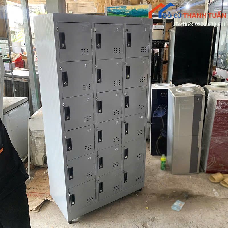 Kho còn nhiều mẫu tủ locker cũ 6 ngăn, 9 ngăn, 18 ngăn đa dạng kích thước phù hợp cho công ty, xưởng hoặc trường học. Quý khách có thể đến trực tiếp Đồ Cũ Thanh Tuấn xem hàng hoặc liên hệ Zalo – hotline để được tư vấn, gửi hình thật và giữ mẫu.