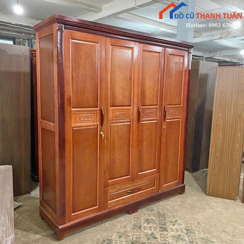 Mô tả: Tủ quần áo với thiết kế 4 cánh, làm từ chất liệu gỗ tự nhiên, màu nâu sang trọng, tạo nên vẻ đẹp ấm cúng cho không gian phòng ngủ. Với kích thước lớn và 4 cánh mở rộng, tủ cung cấp không gian lưu trữ rộng rãi, giúp bạn dễ dàng sắp xếp quần áo và các vật dụng cá nhân khác. Phần tay cầm và các chi tiết chạm khắc tạo điểm nhấn đẹp mắt. Tủ gỗ có độ bền cao, chắc chắn, là lựa chọn lý tưởng cho không gian phòng ngủ gia đình.