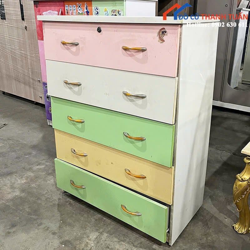 Mô tả: Tủ quần áo với thiết kế 5 tầng rộng rãi, giúp sắp xếp quần áo, đồ cá nhân gọn gàng và dễ tìm. Mỗi ngăn đều có tay nắm riêng, kéo trơn nhẹ, có thêm ngăn trên cùng kèm ổ khóa tiện bảo quản vật dụng quan trọng. Màu sắc pastel nhẹ nhàng gồm hồng, trắng, xanh, vàng phù hợp cho phòng trẻ em hoặc không gian gia đình.