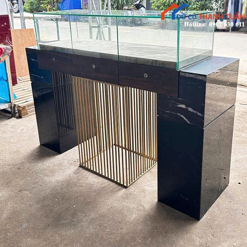 Mô tả: Quầy trưng bày đá hoa cương được thiết kế sang trọng, mang phong cách hiện đại và tinh tế. Phần thân dưới làm từ đá hoa cương, sáng bóng, chịu lực tốt và dễ vệ sinh. Khung giữa bằng sắt mạ vàng chắc chắn, tạo điểm nhấn nổi bật cho không gian. Phía trên là mặt kính trong suốt dày, thích hợp trưng bày mỹ phẩm, trang sức, đồng hồ hoặc vật phẩm trưng bày cao cấp.
