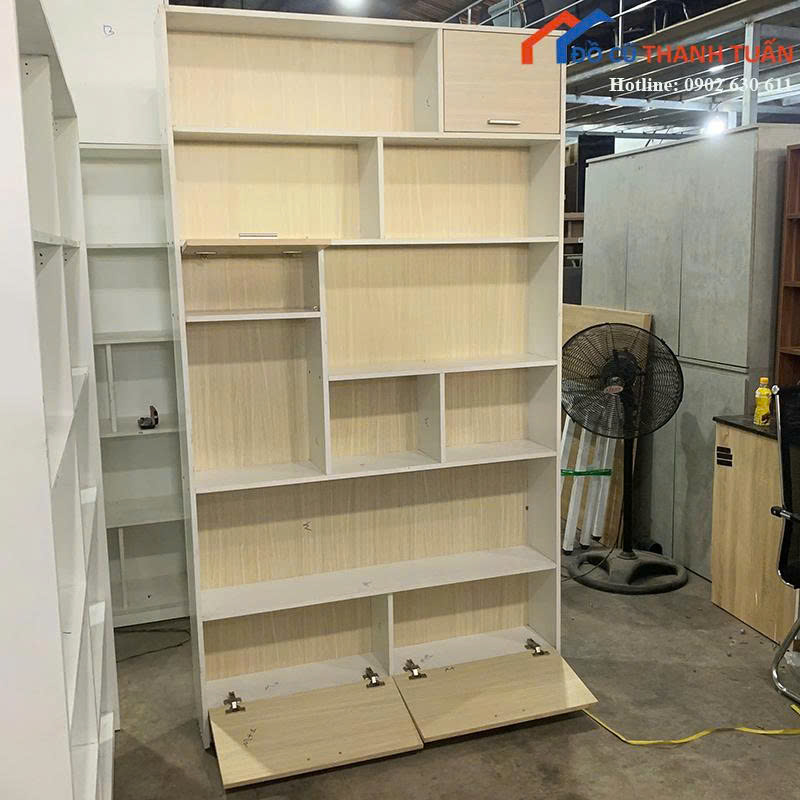 Mô tả: Tủ có thiết kế hiện đại với nhiều ô, ngăn kệ lớn nhỏ khác nhau, cực kỳ linh hoạt cho mọi nhu cầu. Tủ được chia thành nhiều ngăn mở để trưng bày sách, đồ trang trí, sản phẩm bán hàng, và có cả các ngăn hộc kín có cánh mở ở phía trên và dưới, giúp lưu trữ tài liệu hoặc vật dụng cá nhân một cách kín đáo.